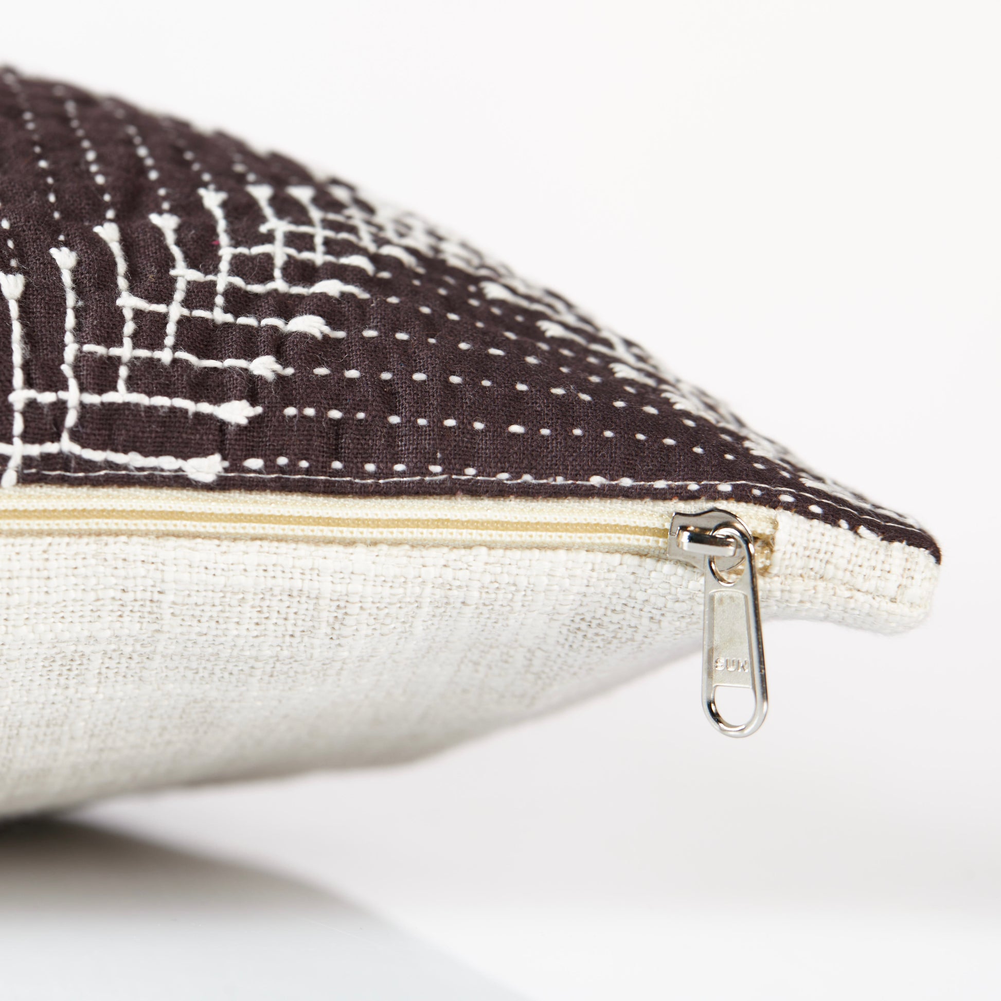 Soid Khowdi cushion cover, hand-quilted by the women of rural North Karnataka, honor tradition with delicate embroidery inspired by native flora and everyday life.