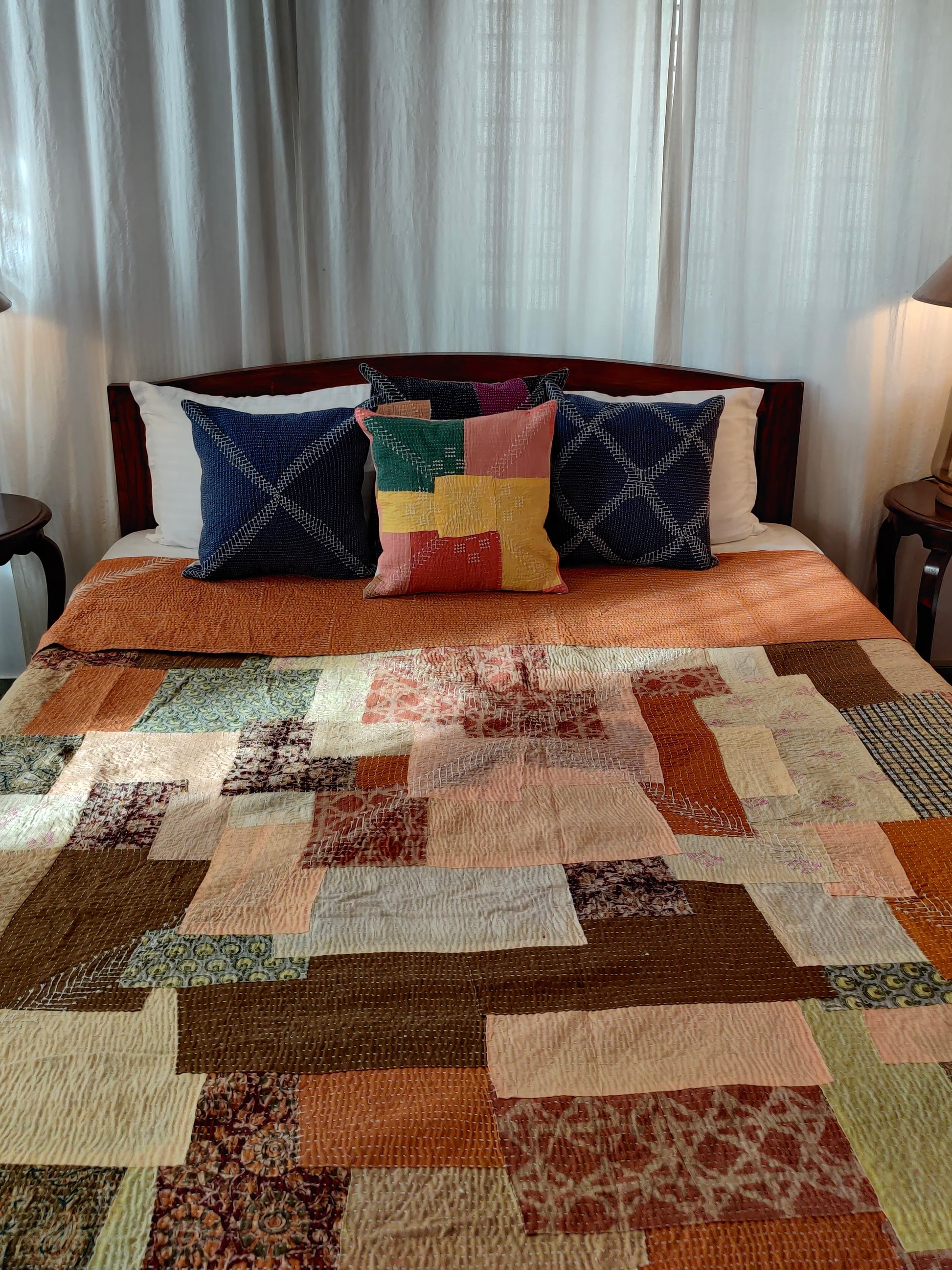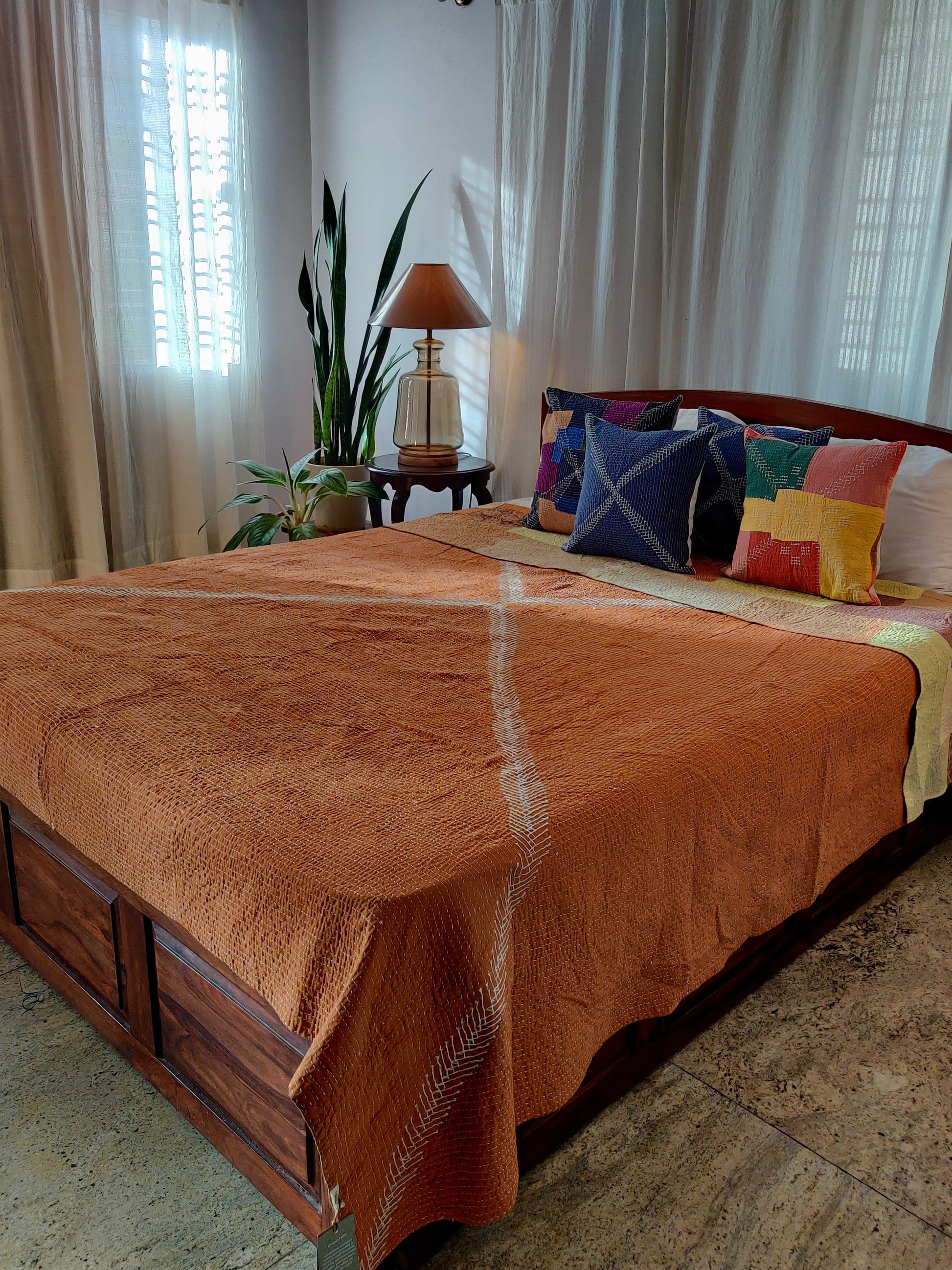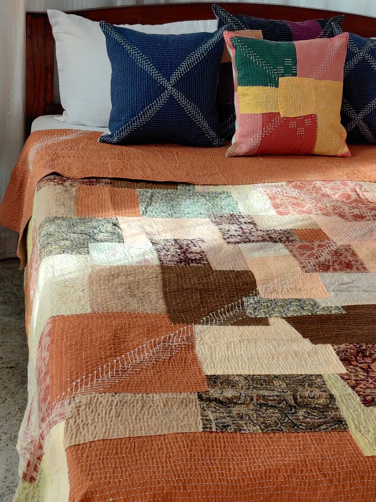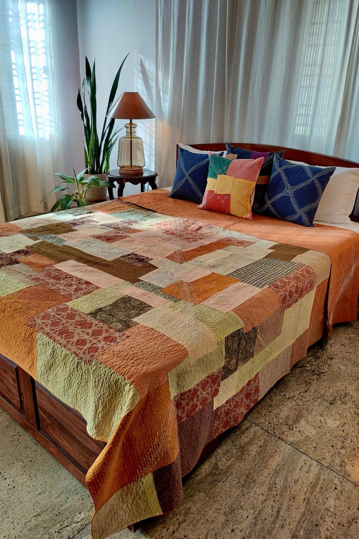 Soid Khowdi cushion cover, hand-quilted by the women of rural North Karnataka, honor tradition with delicate embroidery inspired by native flora and everyday life.